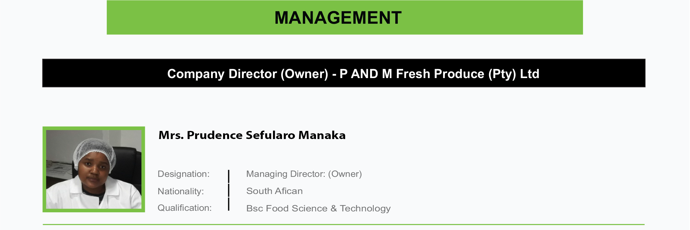 Mrs. Prudence Sefularo is a seasoned entrepreneur who has gone through a rigid training in becoming a professional food scientist and a business leader in a male dominated profession, and her success was born out of day-by-day hardships which intern built her strength. She has in a process developed a number of empowerment ventures in the food & technology environments. As an active director of P AND M Fresh Produce (Pty) Ltd, she is responsible for growing the business and to ensure that it makes a mark in the market place. Her passion is to see women playing a meaningful role in the food industry within the Southern African and the entire African Continent. In 2009 she worked for QPRO International as a Food Controller, in 2009 – 2010 she worked for Air chefs International Company as a 'Quality Assurance Controller', in 2011 she attained a position as a 'TEMP Quality Controller' with Grayston Fruit & Veg Company, and in 2012 she worked for Select a Salad as a Quality Assurance Controller. Her eleven years of experience in the food and Technology industry has thus far proven that women can really become business leaders and pioneers who champion community development initiatives to make South Africa better for all.